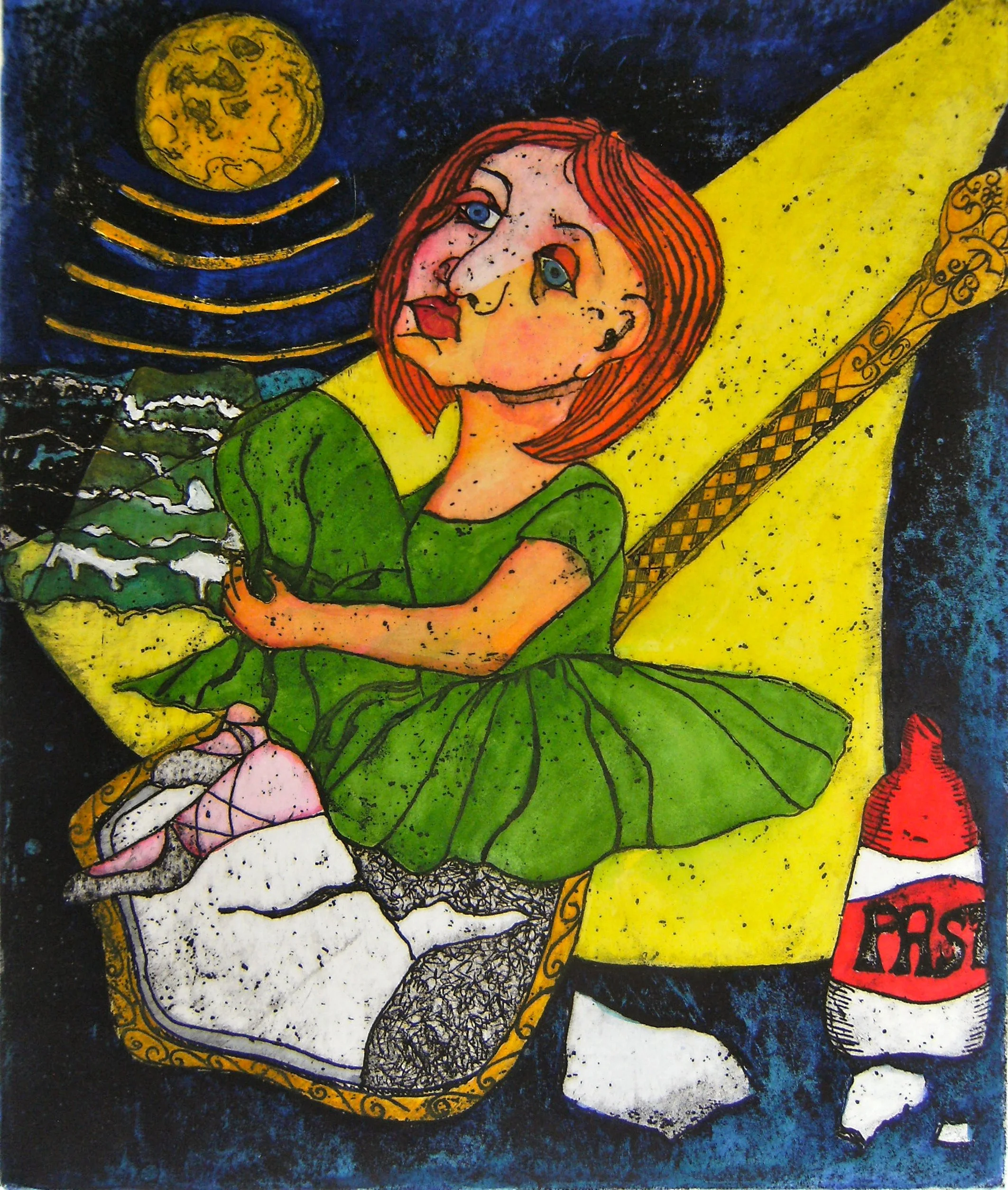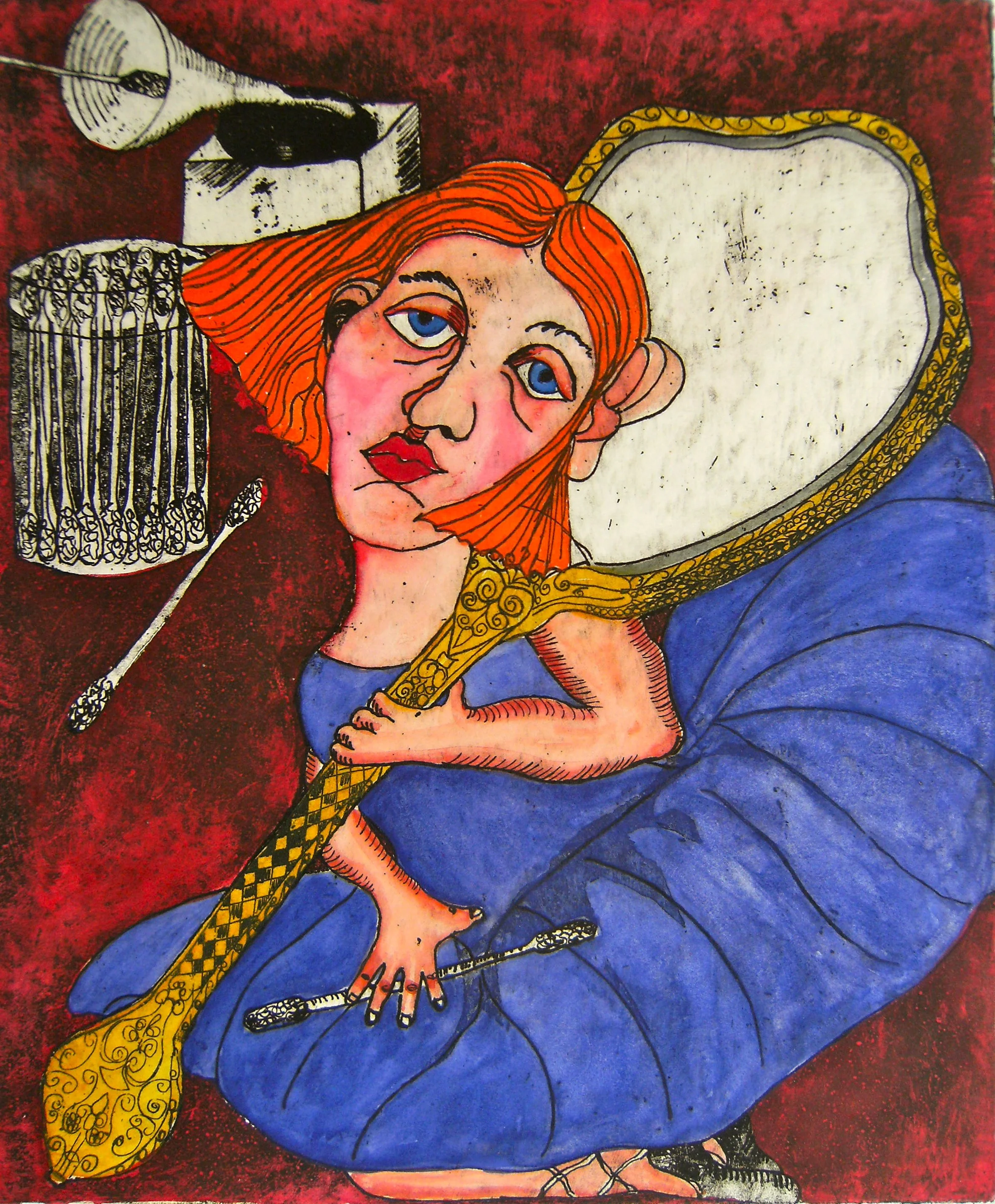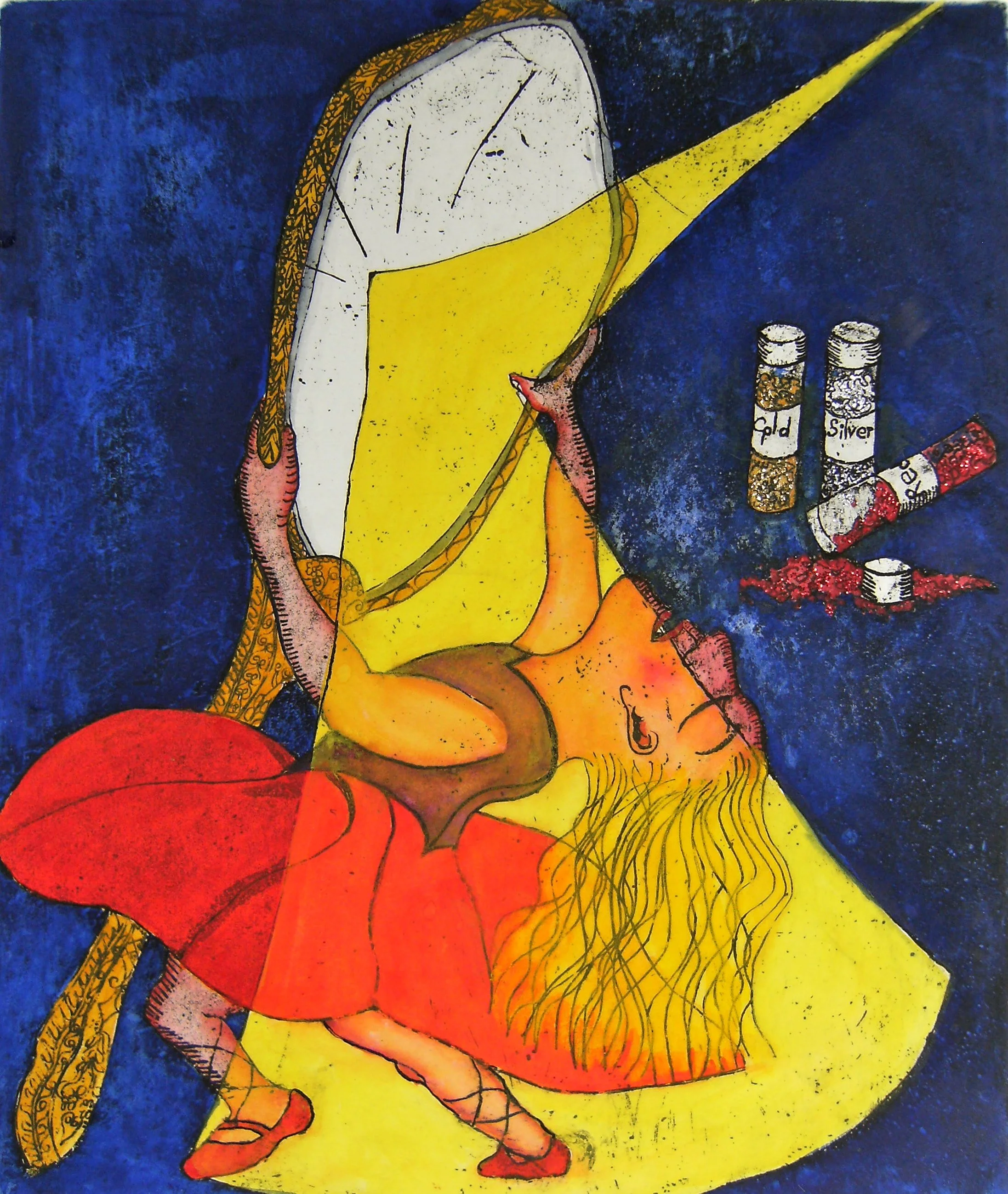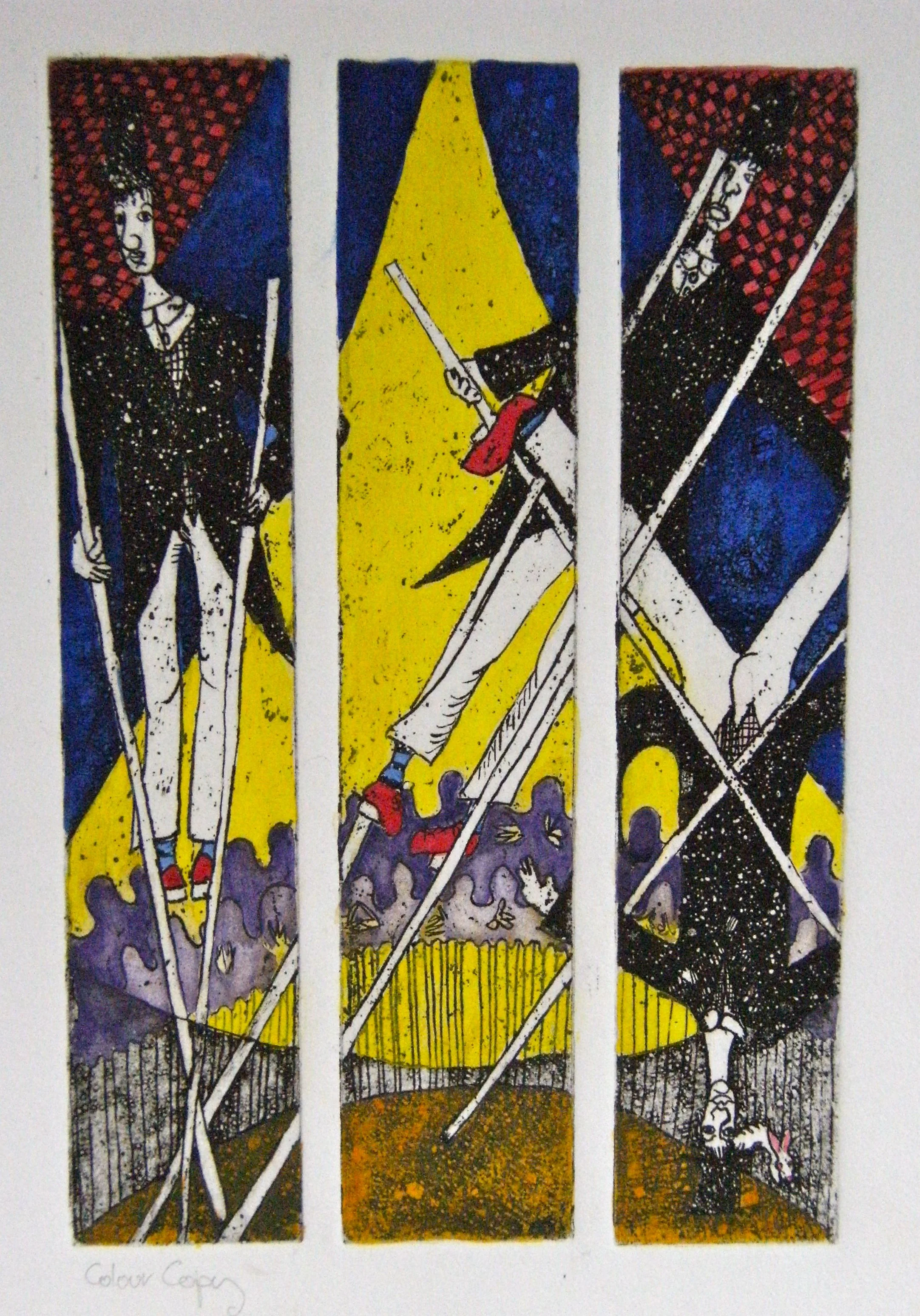 In this series of etchings we have two suites - Mending a Broken Dream and Let me Entertain You. The 4 works in the first suite are a journey in learning to be yourself and Let me Entertain You uses the big top to present several themes - ethical concerns regarding animals being one of them. The pair Lemon Head and The Well could be described as distractions.